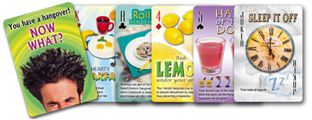 Pack of 12 • 144 in a box54 card deck (including Jokers,13 Clubs, 13 Diamonds, 13 Hearts, and 13 Spades). Each set includes 54 different hangover remedies. Find out which cure works for you!